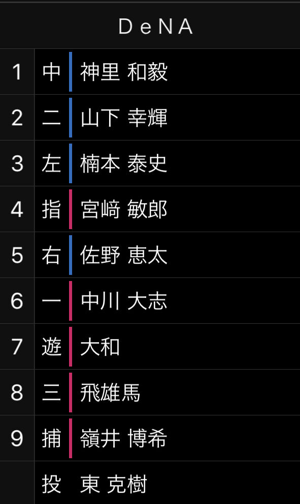 1 中 西川 2 二 菊池 3 遊 小園 4 一 松山 5 捕 會澤(坂倉) 6 右 末包 7 三 田中(林,坂倉) 8 左 上本(長野,中村健)
