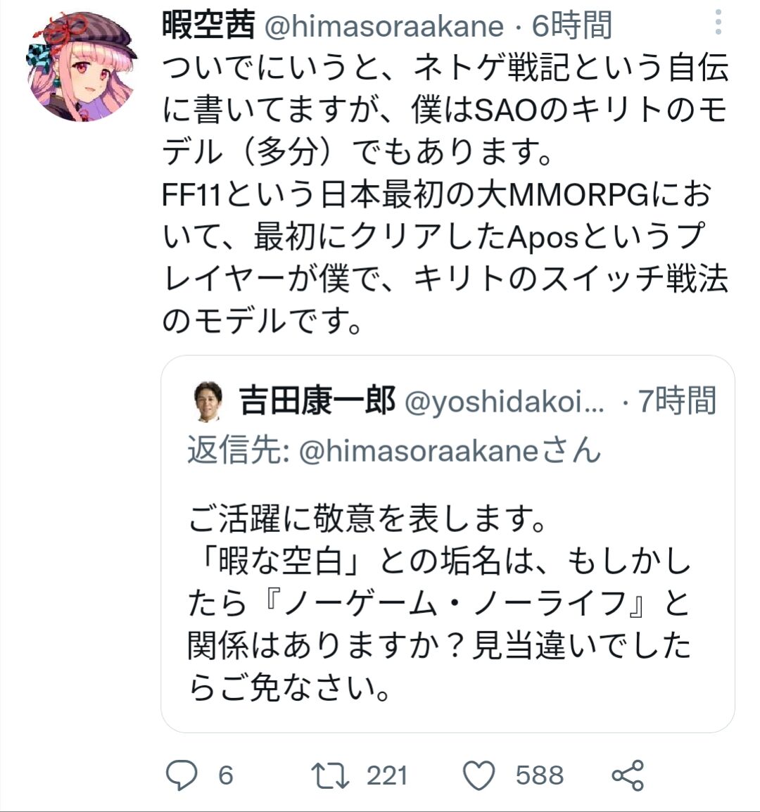 すいません。SAO第一章がネット連載されていた頃から読んでるものとして、暇空さんのファンですがそれは否定よりです。なぜならSAOネット連載は2001年開始で2002年前には第一章が終わってました