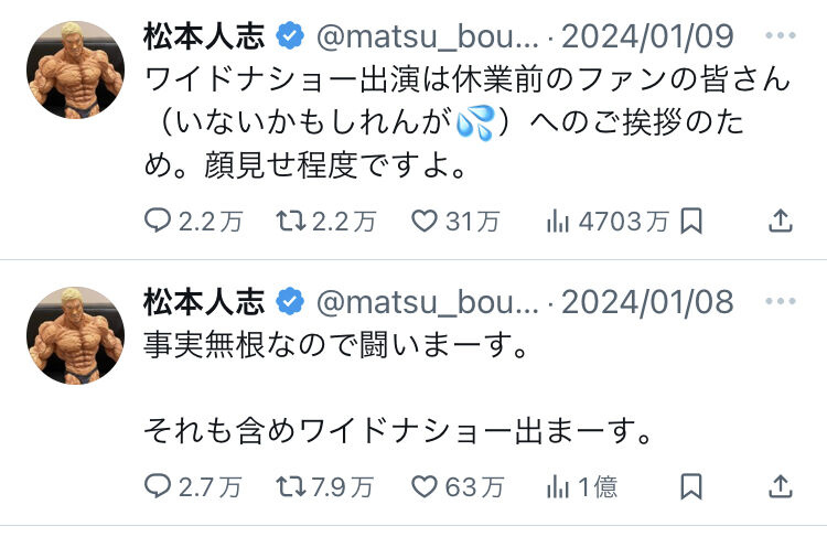こんな雑魚ムーブかまされたら会見開いて潔く引退した紳助の株上がってまうやろ