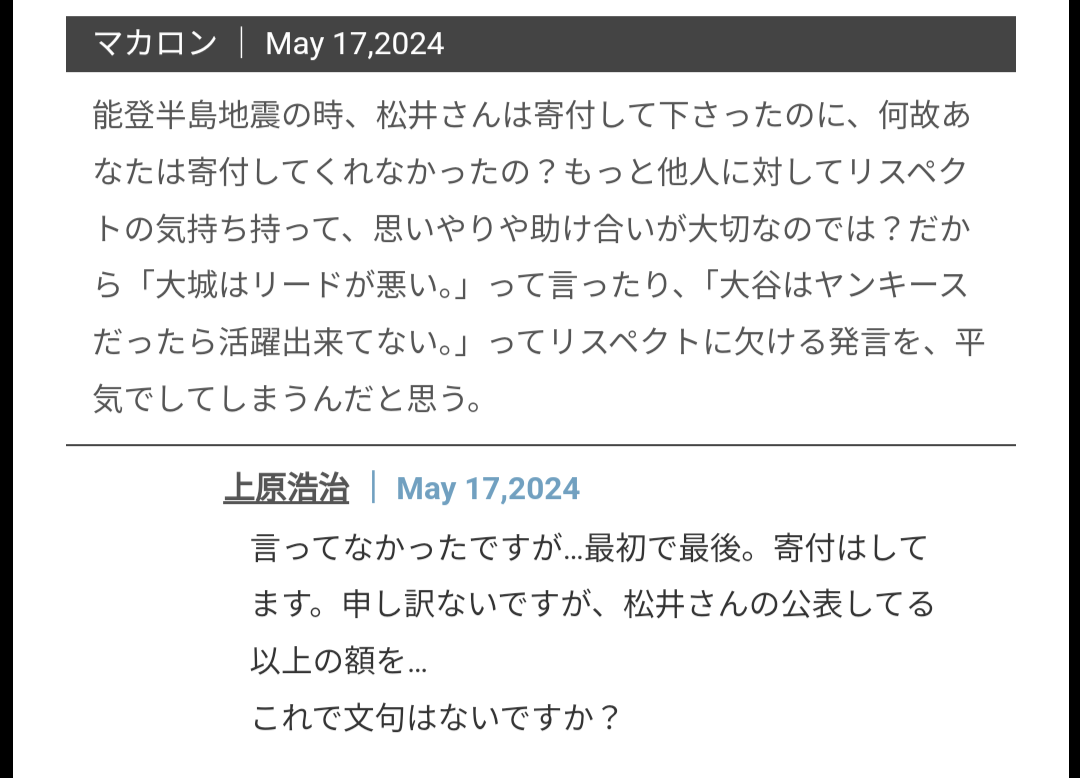 能登半島地震の時、松井さんは寄付して下さったのに、何故あなたは寄付してくれなかったの?もっと他人に対してリスペクトの気持ち持って、思いやりや助け合いが大切なのでは?だから「大城はリードが悪い。」って言ったり、「大谷はヤンキースだったら活躍出来てない。」ってリスペクトに欠ける発言を、平気でしてしまうんだと思う。