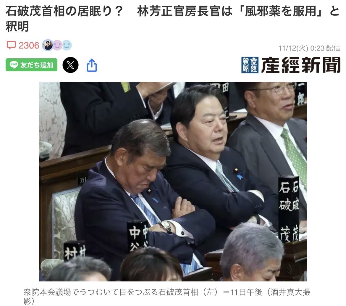 林芳正官房長官は11日夜の記者会見で、石破茂首相が同日の衆院本会議での首相指名選挙中、しばらくうつむき、目をつぶる一幕があったことについて「(首相は)深夜まで多忙を極める毎日を送っているが、本日は風邪気味で風邪薬を服用していたと聞いている」と釈明した。X(旧ツイッター)上に関連の動画が投稿され、「居眠りをしている」などのコメントが寄せられていた。
