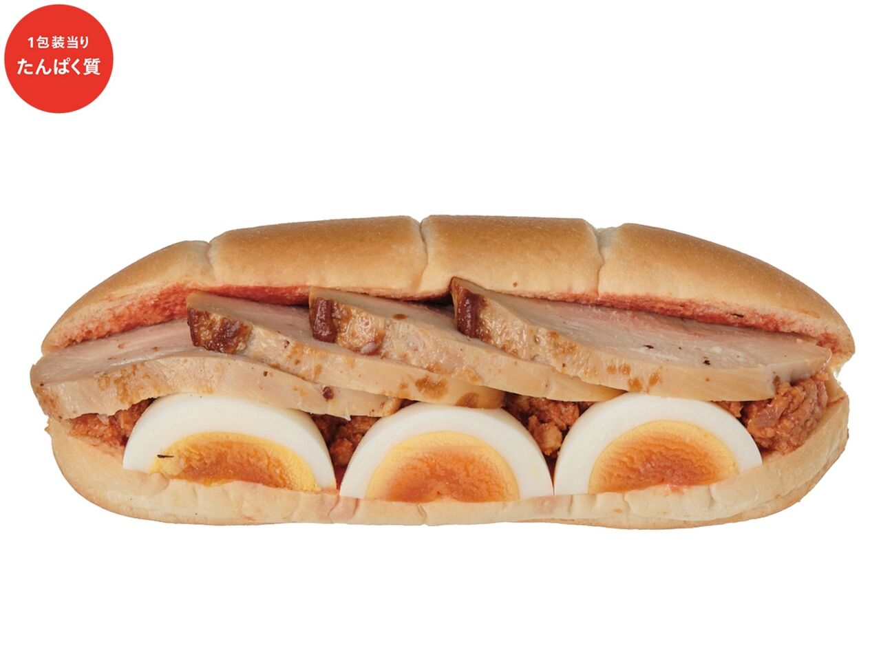 ローストチキンと半熟ゆで玉子、チリソイミートを組み合わせた食べ応えのあるロールパンです。