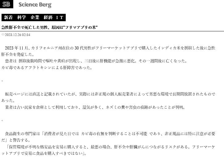 >>カリフォルニア州在住の30代男性がフリーマーケットアプリで購入したインディカ米を摂取した後に急性肝不全を発症した。